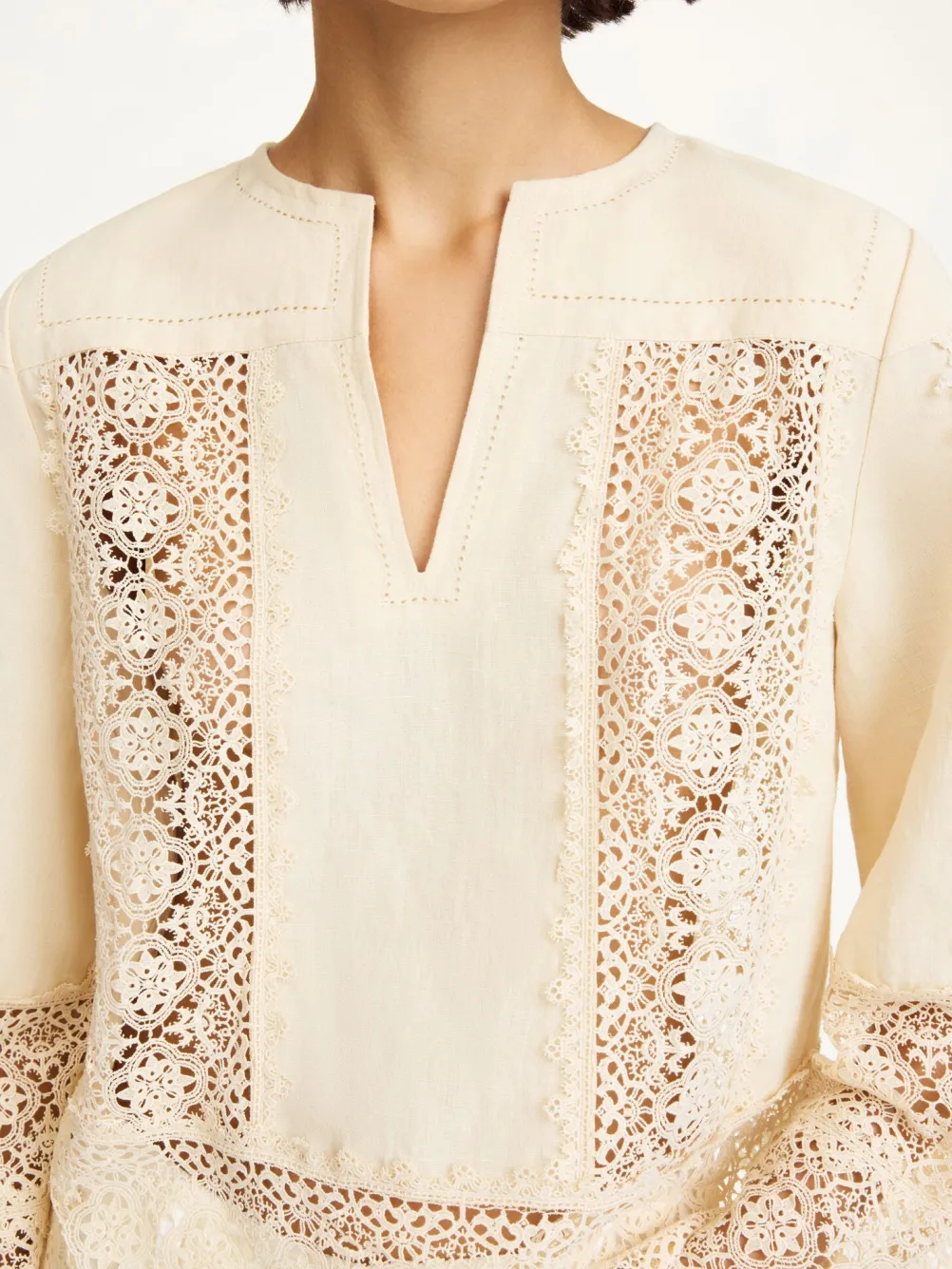 Smuk og eksklusiv bluse med de fineste blondedetaljer fra By Malene Birger. Med v-udskæring og brede ærmer. Tidsløs bluse, der kan bruges sæson efter sæson.