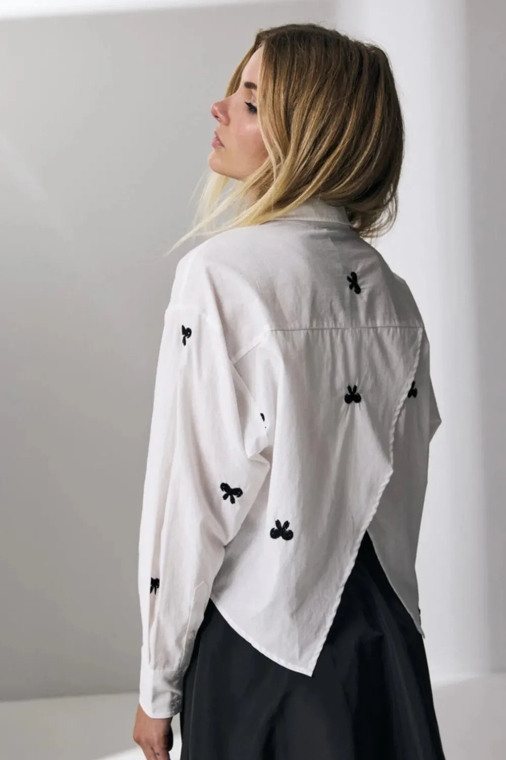 Flot cropped hvid skjorte fra Co’couture med fine små broderinger. Skjorten har en flot udskæring på ryggen. Med skarp krave og manchetter.