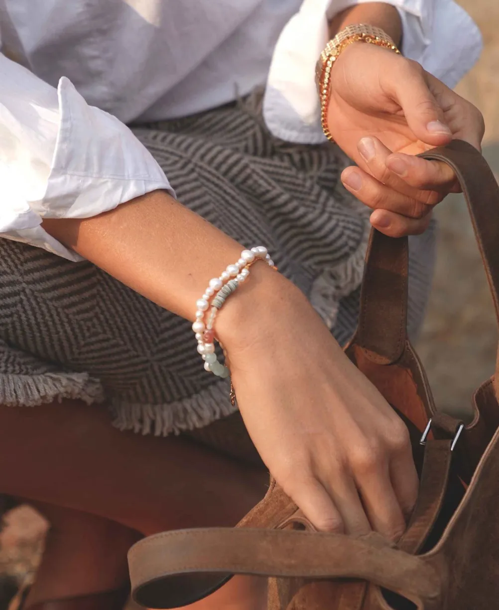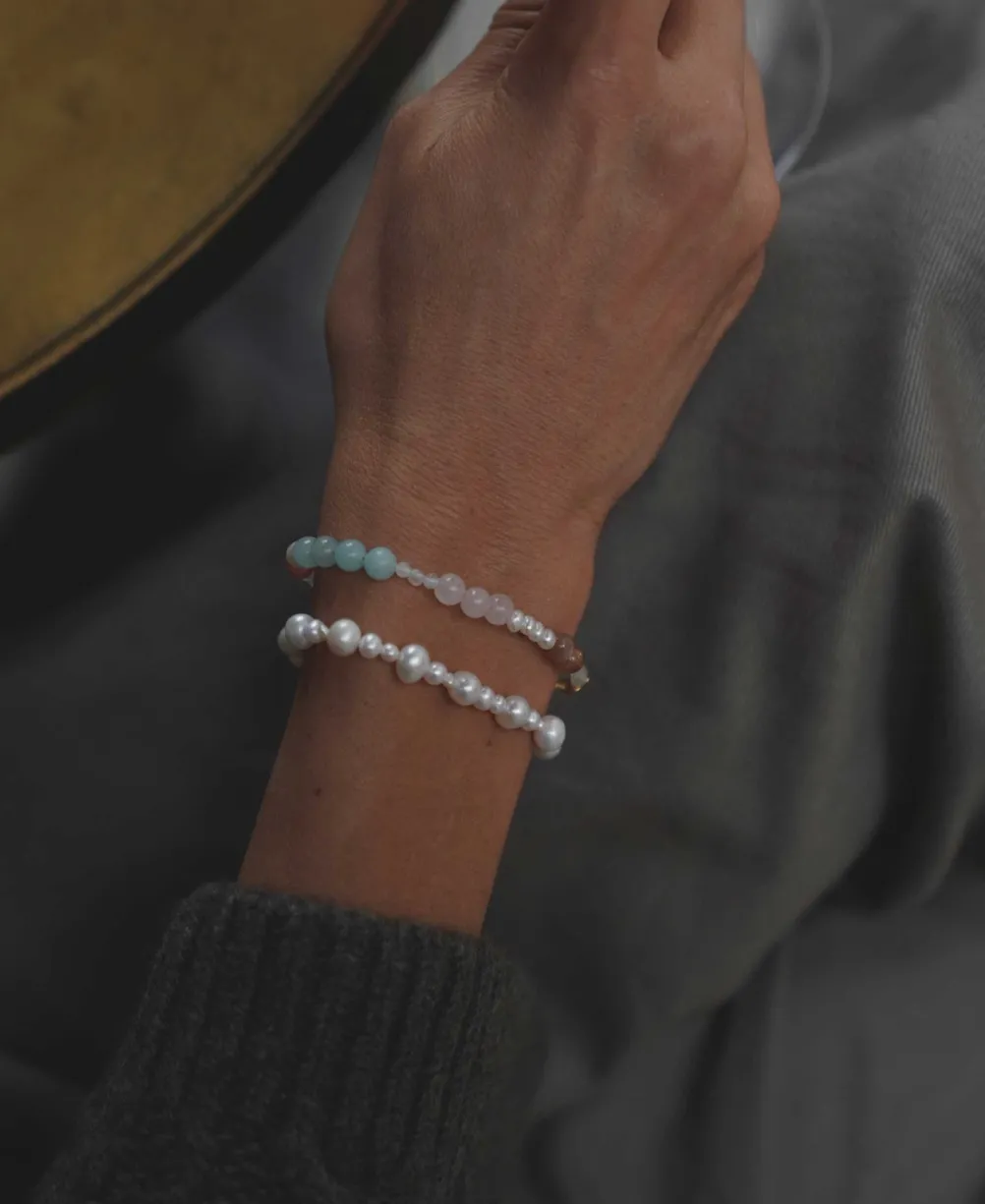 Smukt og unikt farverigt armbånd fra Hultquist Copenhagen med ferskvandsperler og koralfarvede perler.