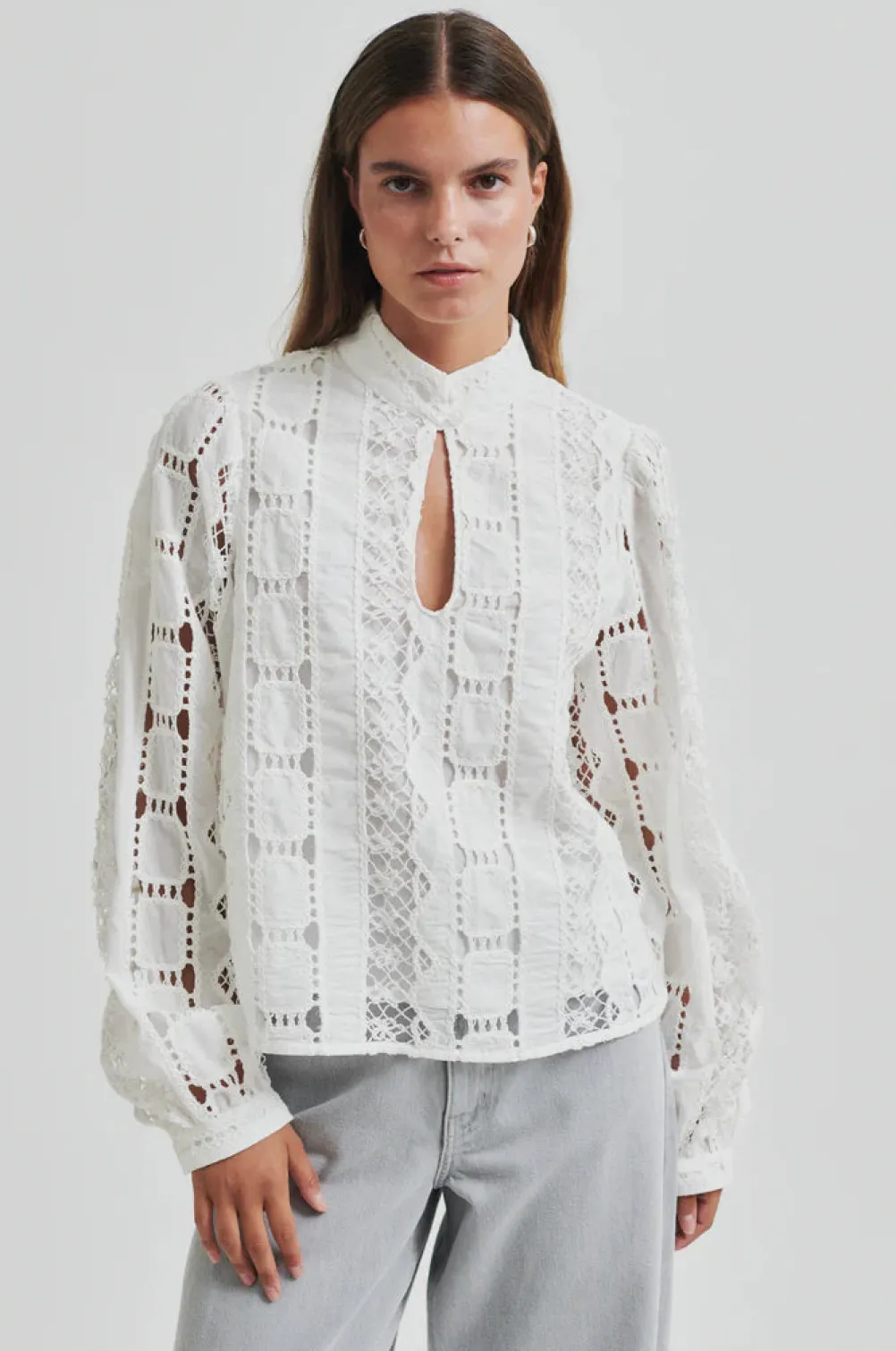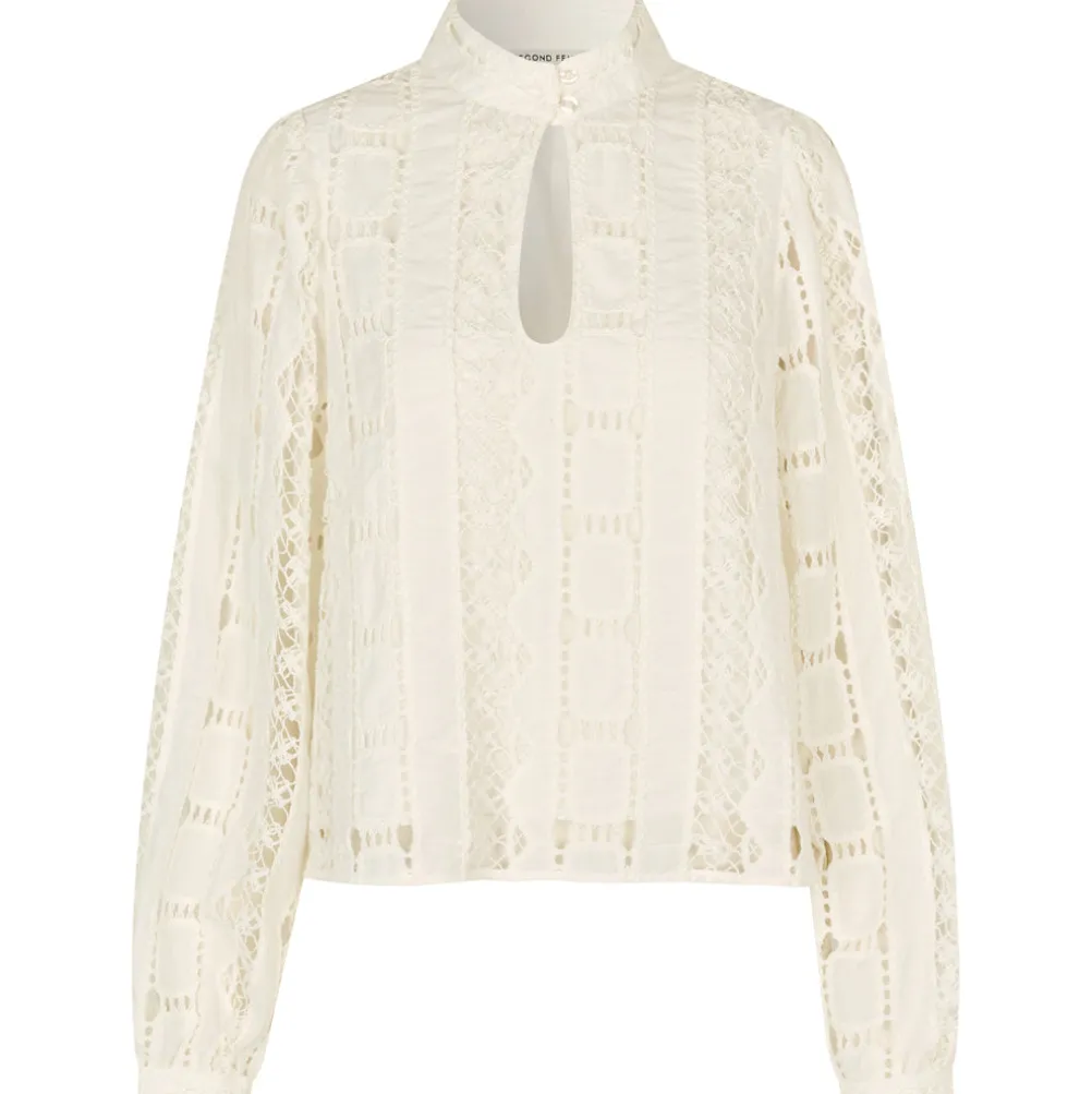 Flot hæklet bluse fra Second Female med høj hals og nøglehulsudskæring. Fremstillet i let og blød bomuld. Med løse puffærmer.